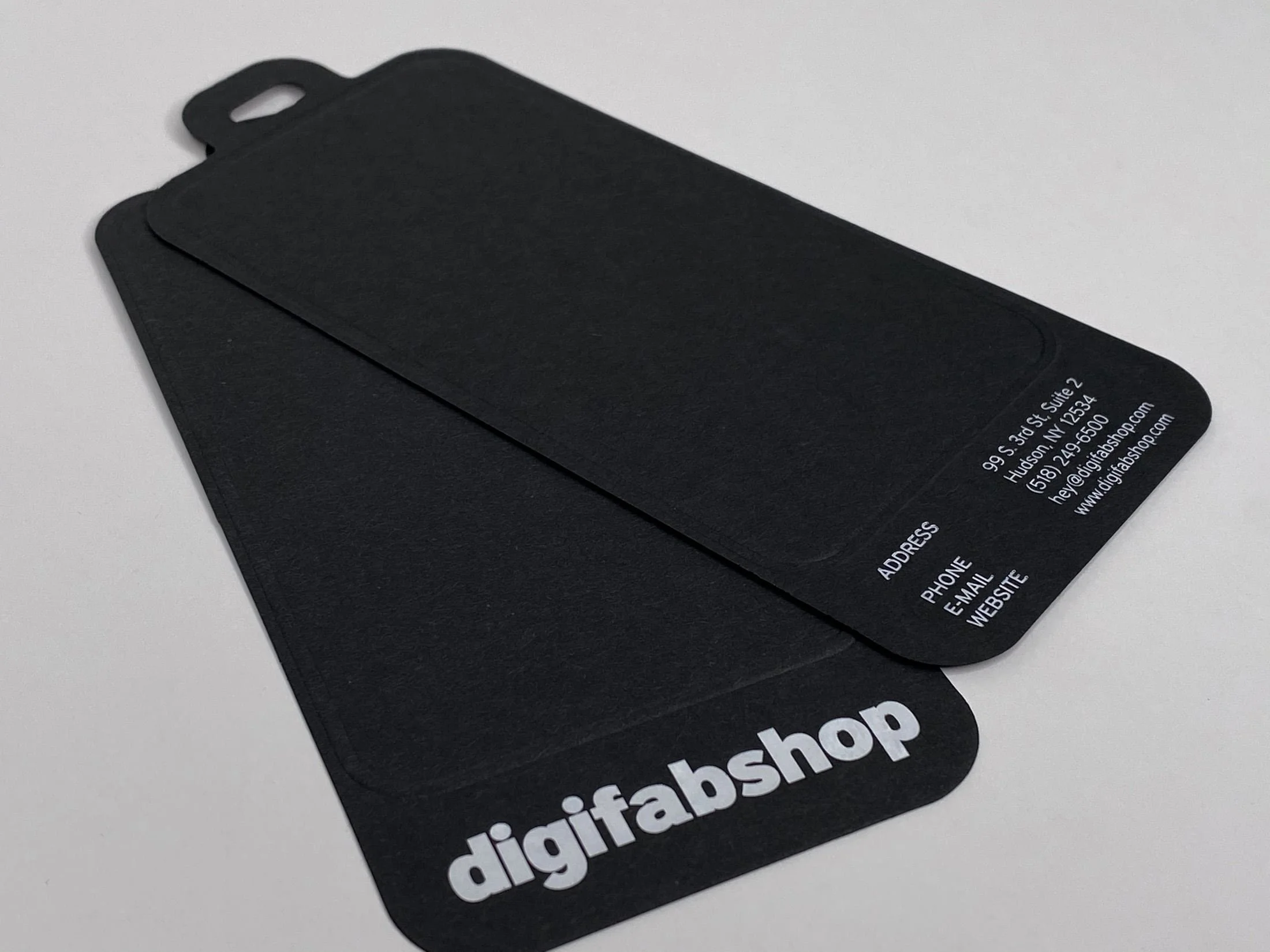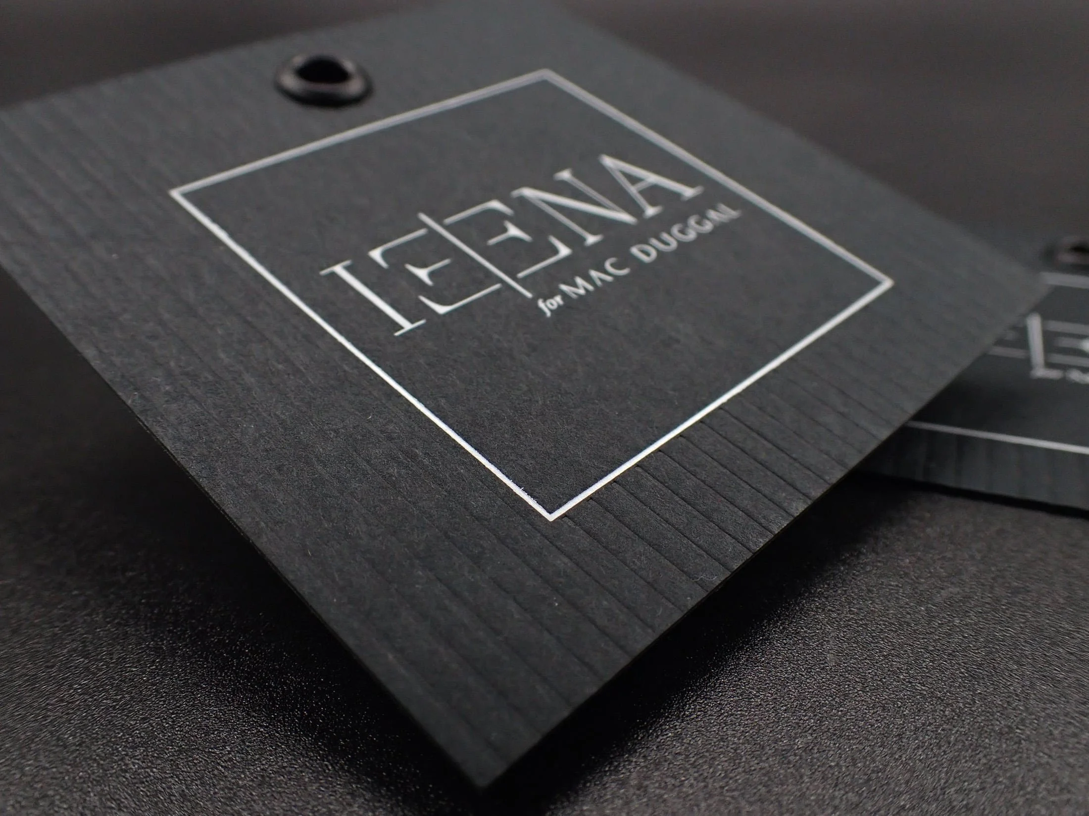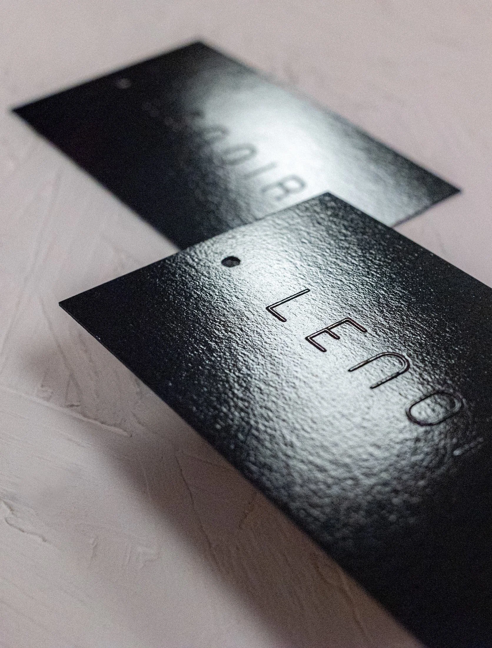 Black paper hangtags are designed for durability and repeated handling. White ink, foil, and embossing create clear, resilient marks that stay sharp through use and handling.